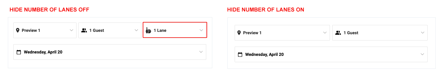 • Hide Number of Lanes: If your reservations are all 1 lane and showing the number of lanes is not important, you can choose to hide that option from the reservation page.