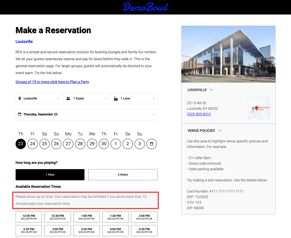 Please show up on time. Your reservation may be forfeited if you arrive more than 15 minutes past your reservation time.
