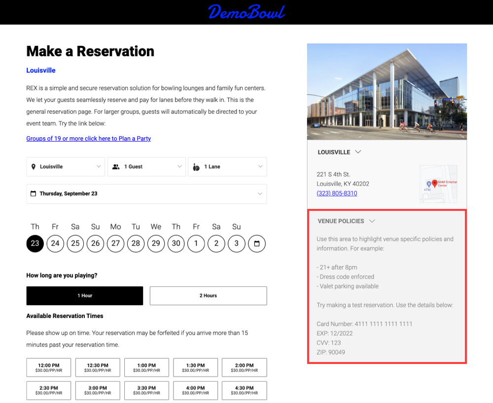 The Venue Policies text box is used to highlight venue-specific policies that you want guests to be aware of before making a reservation.