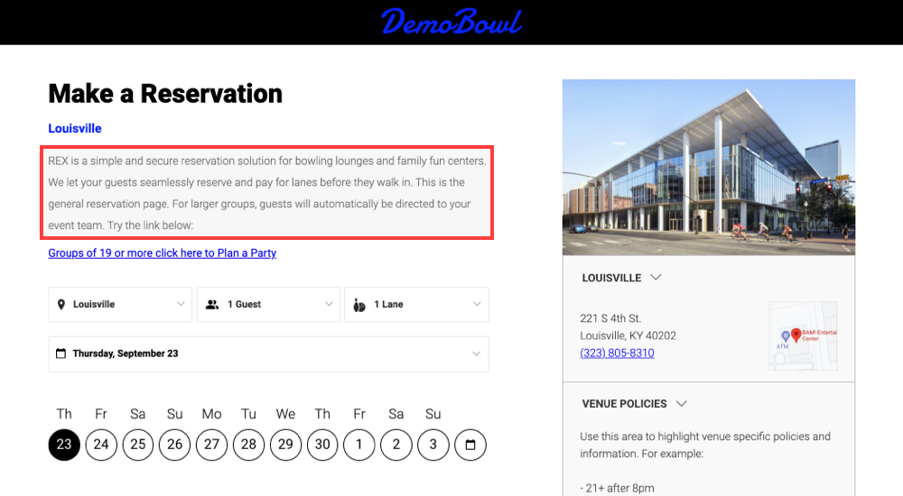 Your reservation page has a variety of text blocks that contain specific venue information. This article explains how to update the language on your REX site.