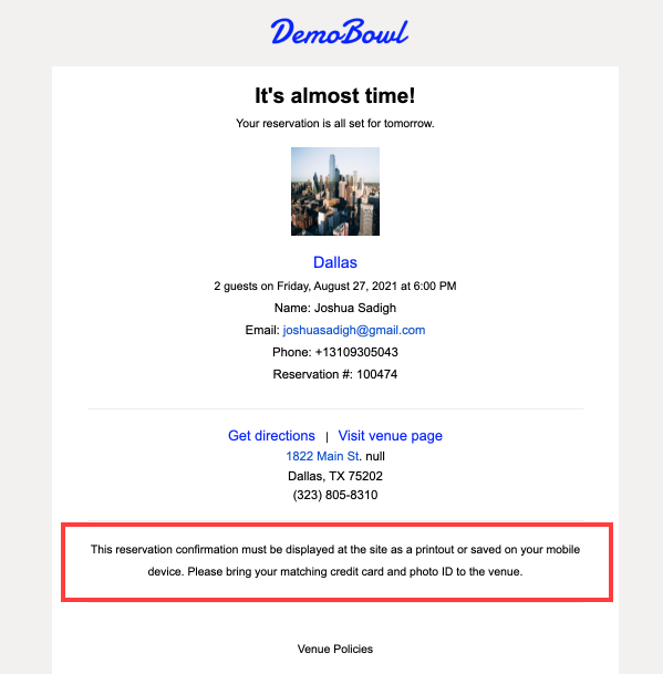 You can customize some of the info on the confirmation email a guest receives after making a reservation.