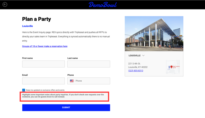 Demo Bowl is the perfect place for your next event. Fill out the form below and one of our event specialists will be in touch to plan your event.